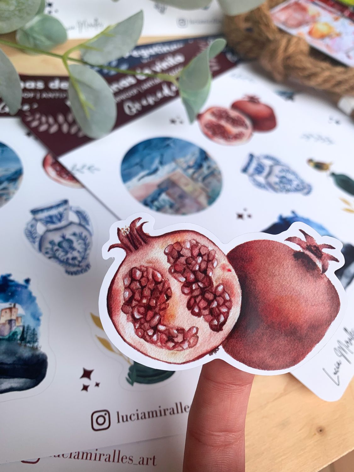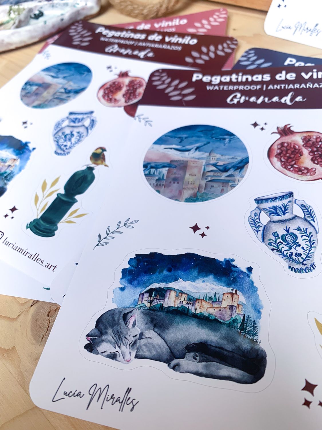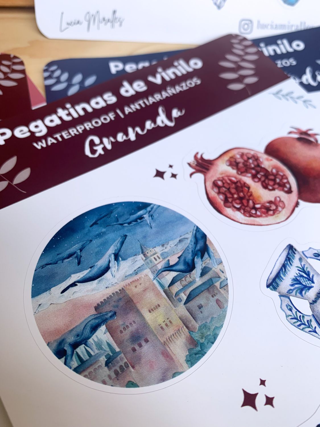 Set de 5 pegatinas Granadinas. Contiene: granada, bolardo, jarrón Fajalauza, Alhambra ballenas, gato Alhambra.