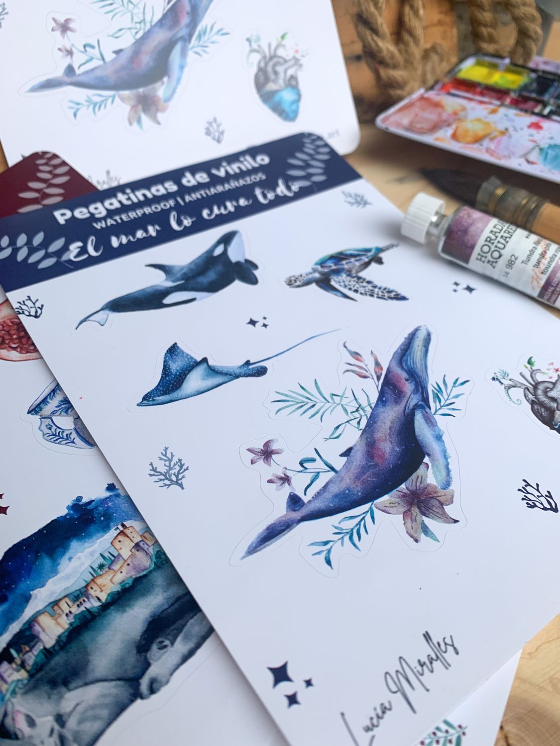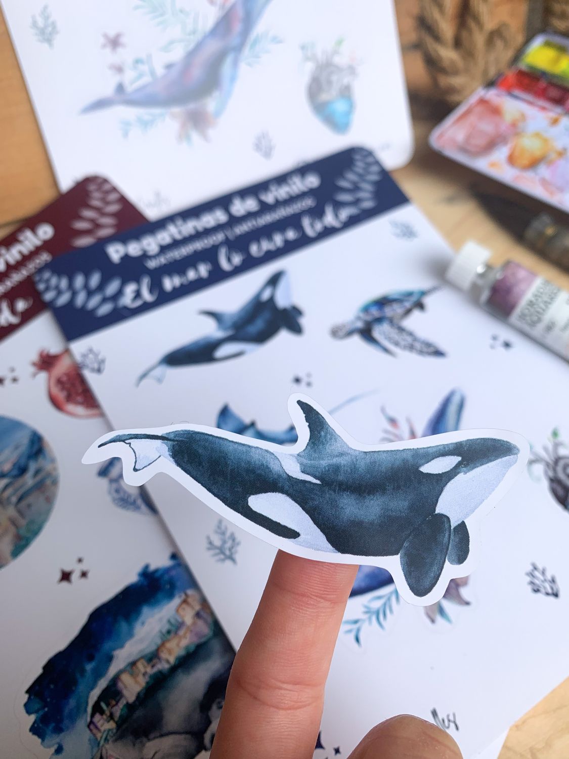 Set de 5 pegatinas marinas. contiene: orca, corazón mar, ballena flores, raya y tortuga.
