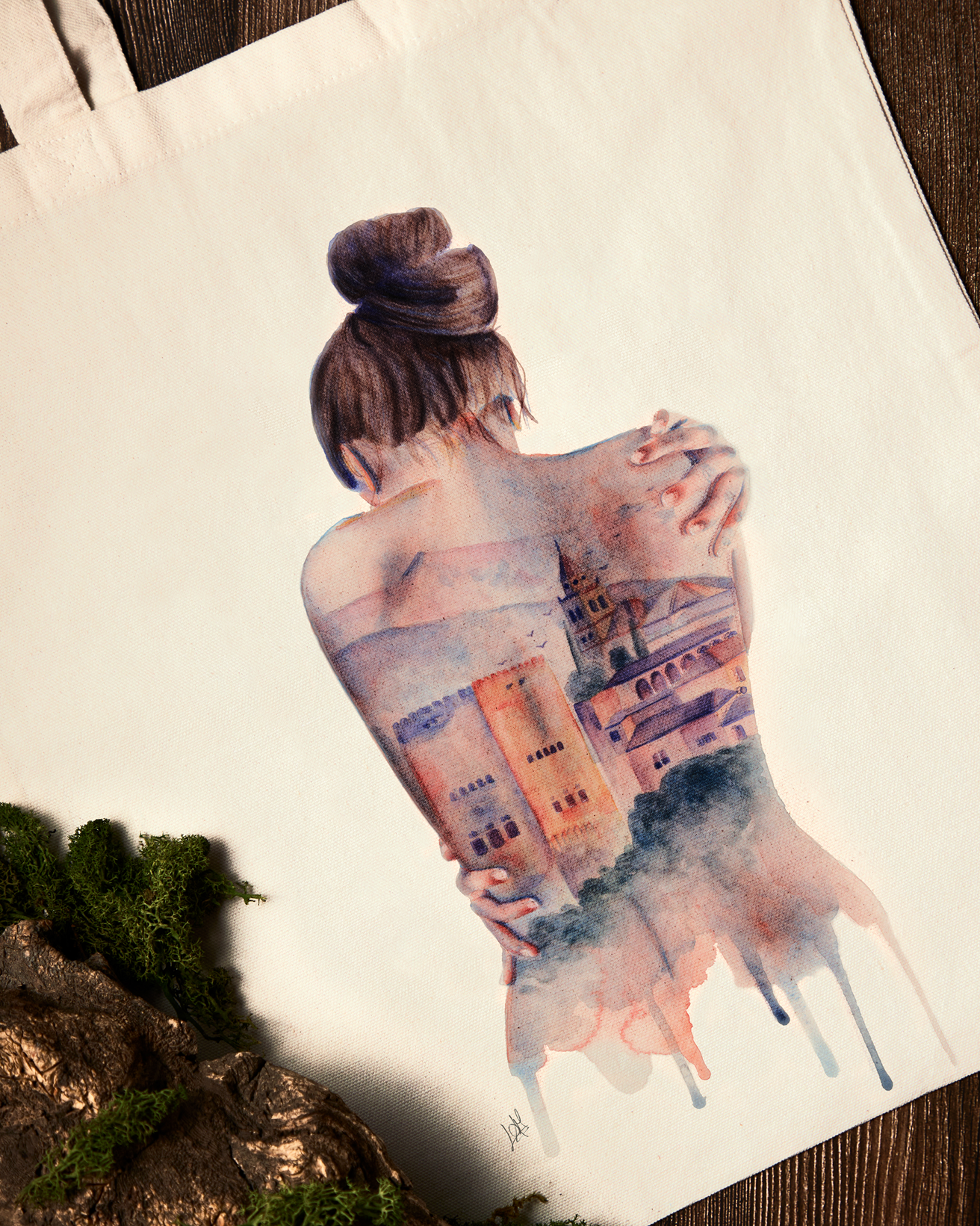 Bolso 100% algodón de 240g. En la parte trasera tienen un bolsillo muy útil para guardar el móvil o llaves. Se puede doblar sobre sí mismo y cerrar con un botón como se ve en la imagen.