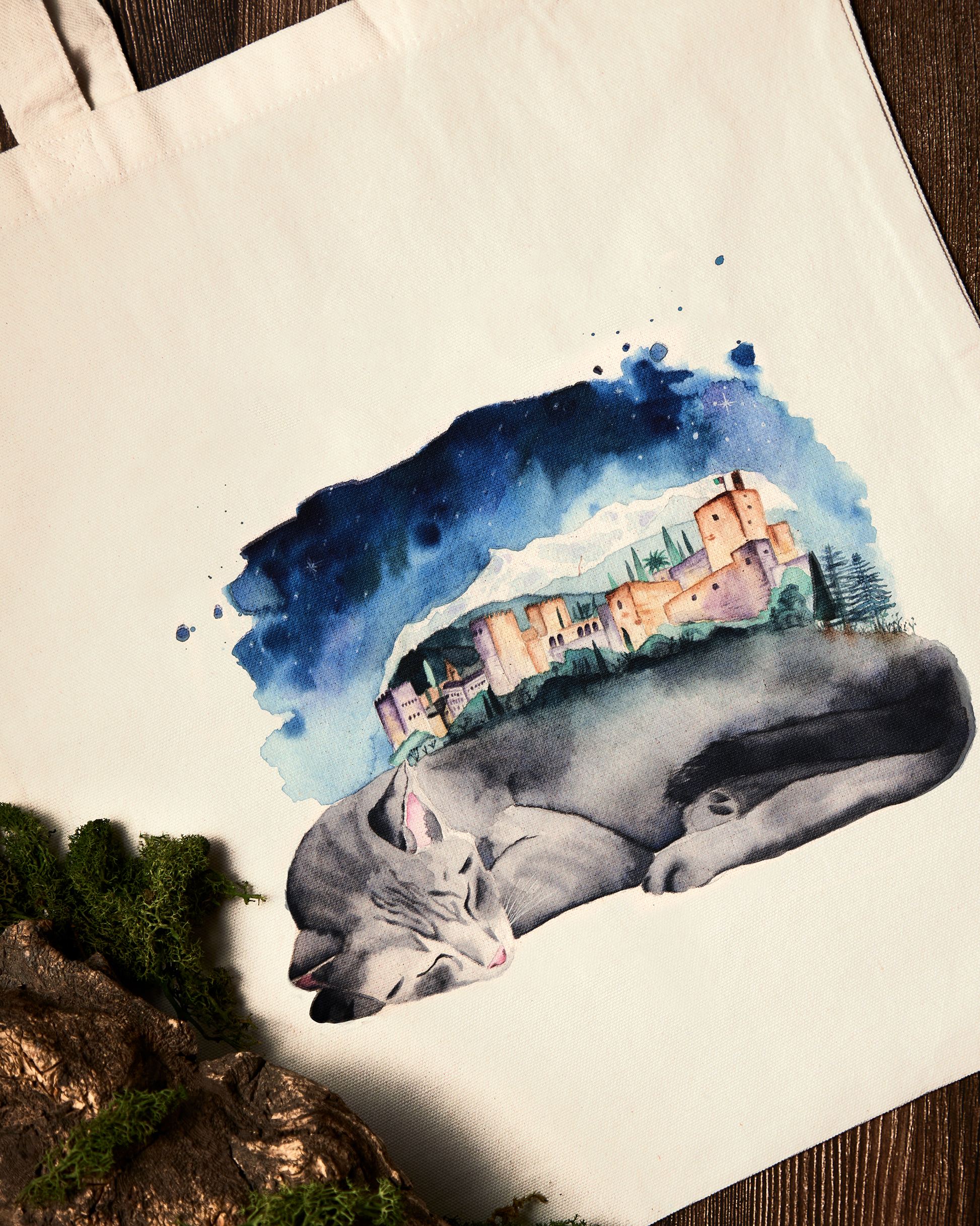 Bolso 100% algodón de 240g. En la parte trasera tienen un bolsillo muy útil para guardar el móvil o llaves. Se puede doblar sobre sí mismo y cerrar con un botón como se ve en la imagen.