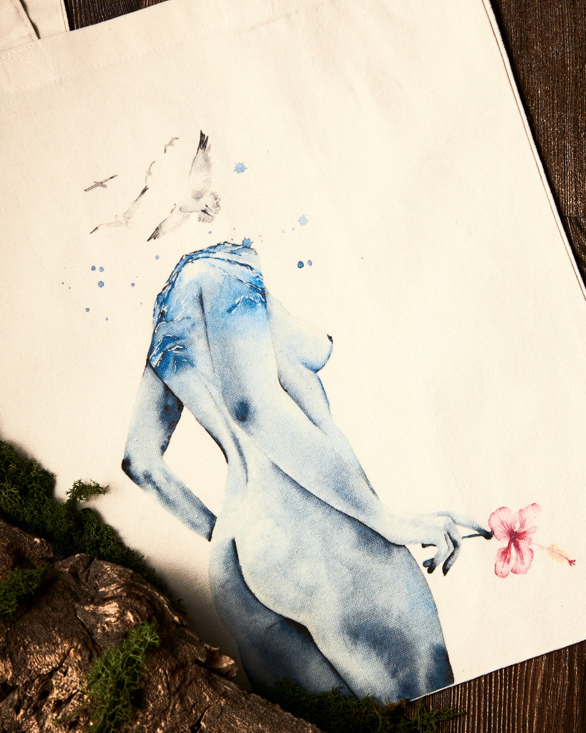 Bolso 100% algodón de 240g. En la parte trasera tienen un bolsillo muy útil para guardar el móvil o llaves. Se puede doblar sobre sí mismo y cerrar con un botón como se ve en la imagen.