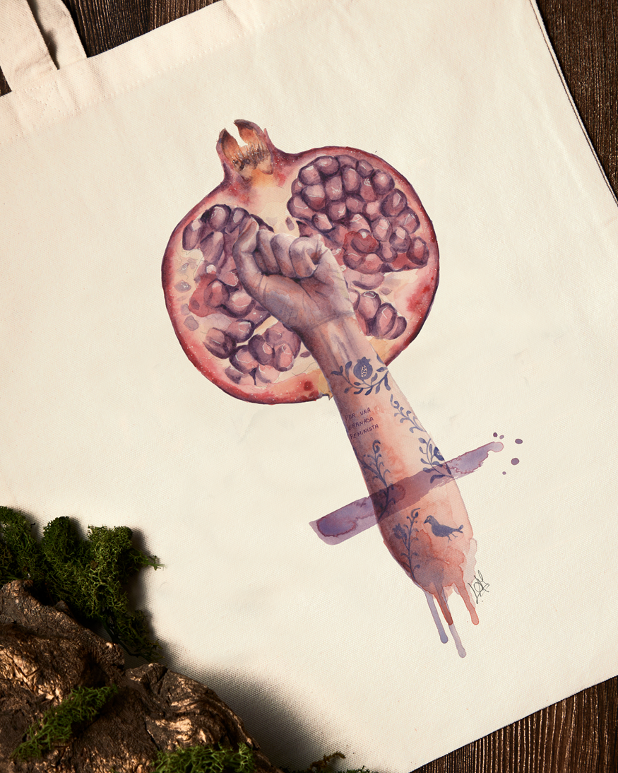 Bolso 100% algodón de 240g. En la parte trasera tienen un bolsillo muy útil para guardar el móvil o llaves. Se puede doblar sobre sí mismo y cerrar con un botón como se ve en la imagen.